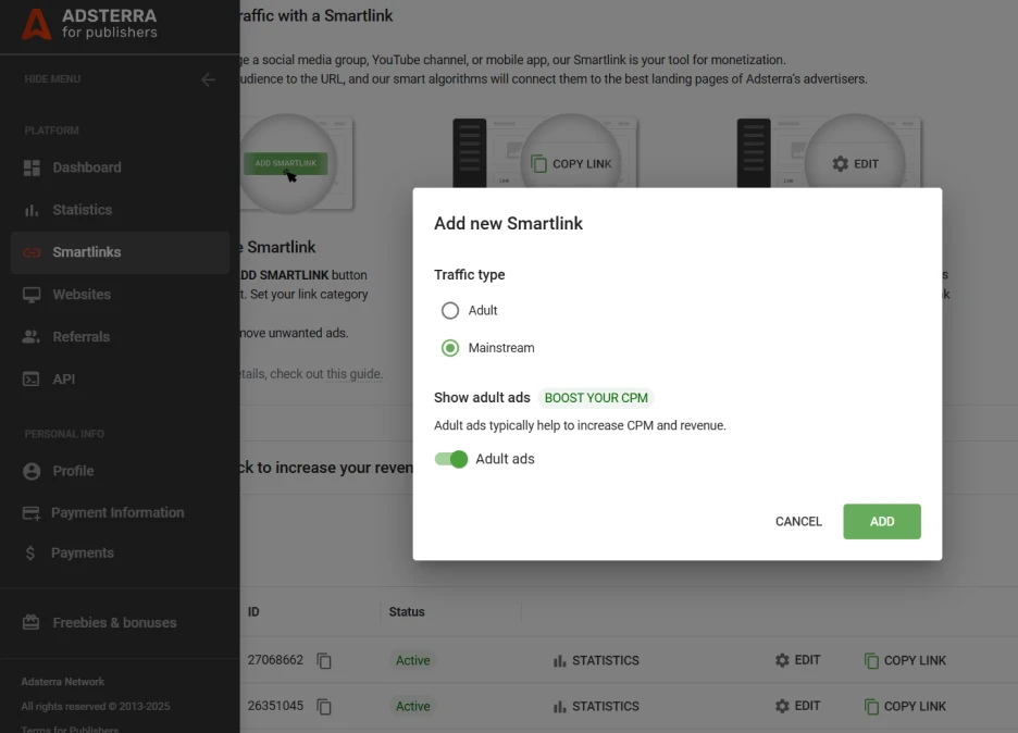 You can get a +5% ad earnings bump if you refer other publishers or webmasters to join Adsterra.